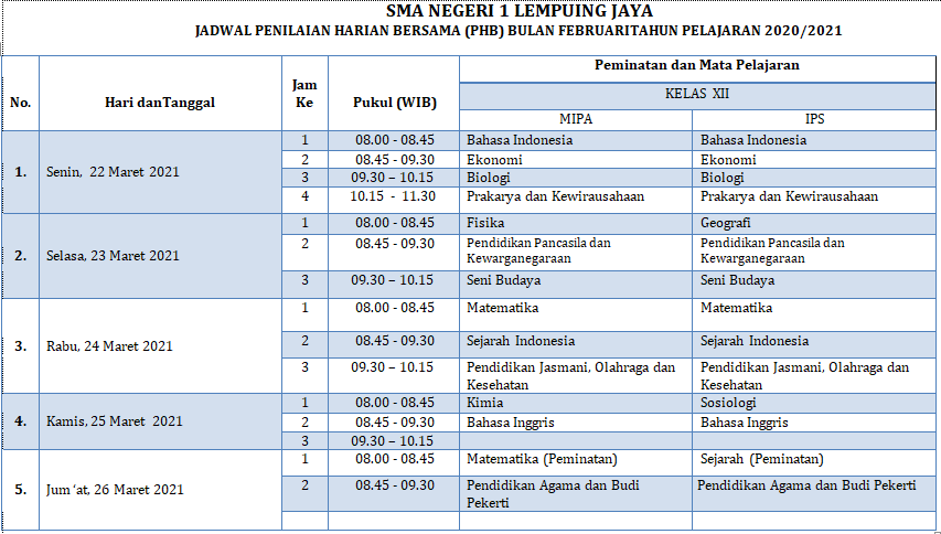 Penilaian Harian Bersama PHB Bulan Maret Tahun 2021 bagi siswa SMA Negeri 1 Lempuing Jaya kelas XII akan dimulai Kamis, 25 Maret 2021 sampai dengan Rabu, 31 Maret 2021. Ujian dilaksanakan dengan metode Daring (Online).