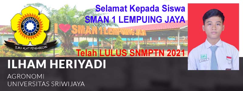 Selamat kepada siswa SMA NEGERI 1 LEMPUING JAYA yang telah diterima di Perguruan Tinggi Negeri melalui seleksi SNMPTN Tahun 2001.
